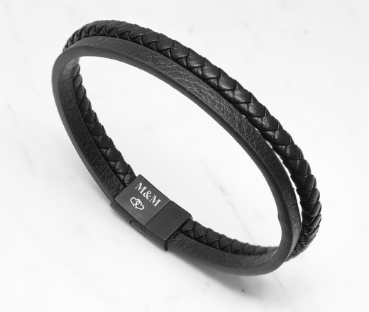 Bransoletka męska z grawerem czarna skóra 1858/1 trzy przekładki