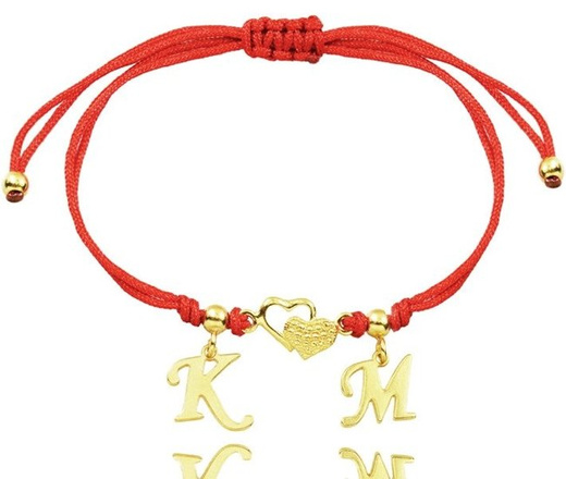 1043 BRANSOLETKA Z GRAWEREM inicjały literki złote z połączonymi sercami na sznureczku
