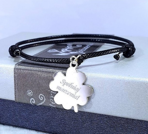 BR483 Bransoletka z grawerem koniczynka, Srebrna 925 na sznurku
