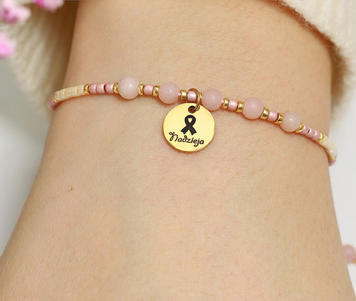 Różowa bransoletka z kamieniami naturalnymi z grawerem na gumce 1870