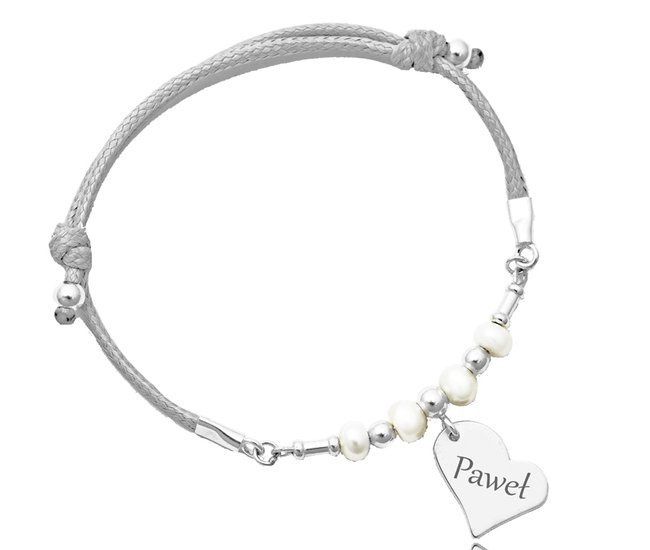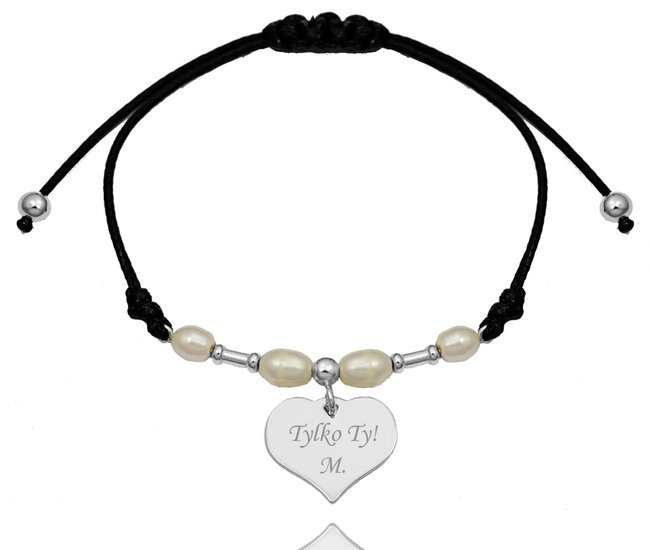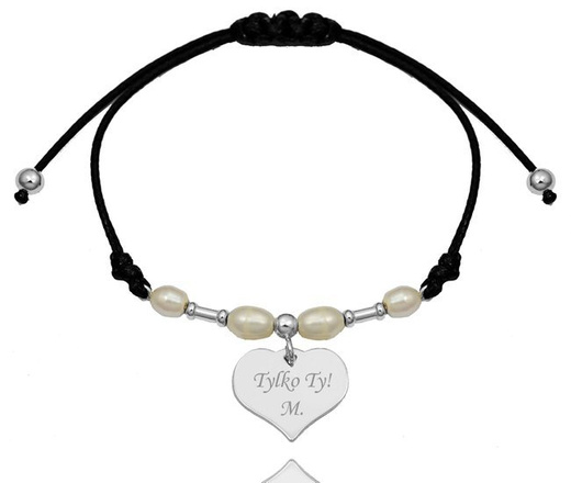 1151 bransoletka grawerowana srebrna na sznurku perełki naturalne serce