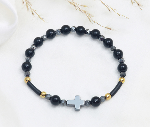 bransoletka różaniec czarny onyks stal złocona 1877/21