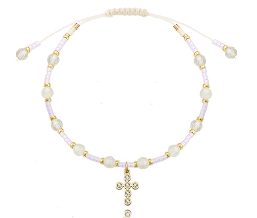 1571/17 bransoletka różaniec złota na sznureczku z koralikami z masy perłowej i krzyżem