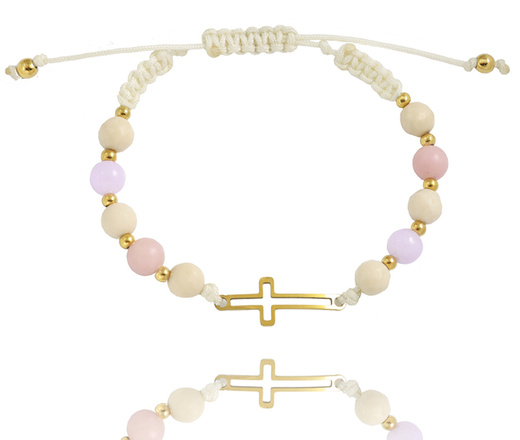 1571/17 bransoletka różaniec złota na sznureczku z koralikami z masy perłowej i krzyżem