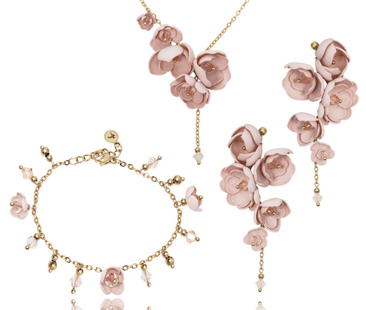 komplet pozłacany z kwiatuszkami i kryształami handmade pudrowy róż 1816/3