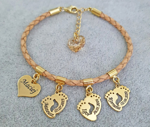 1220 bransoletka z grawerem skórzany rzemień cztery zawieszki do wyboru srebro 925 pozłacane