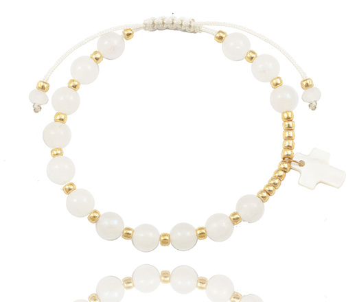1571/14 bransoletka różaniec złota na sznureczku z jadeitem i krzyżem z masy perłowej