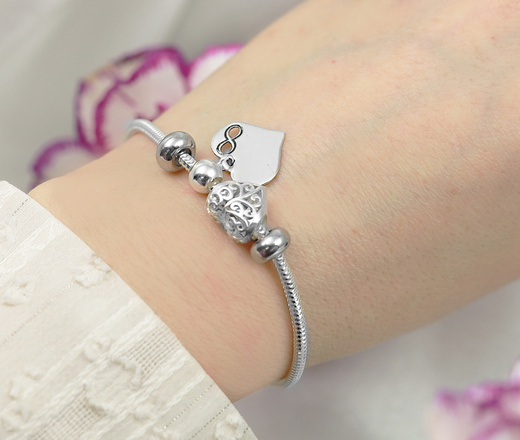 1697/2 bransoletka grawerowana z perełkami i srebrnym sercem ze stópkami