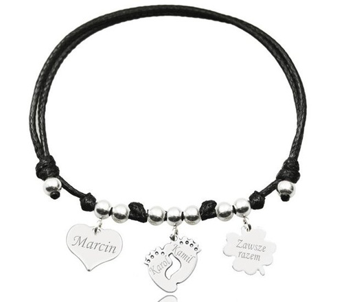 BR984 BRANSOLETKA z grawerem na sznureczku stópki serce inicjał literka