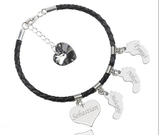 Br1005 bransoletka z grawerem 4 zawieszki na rzemyku skórzanym stópki serce