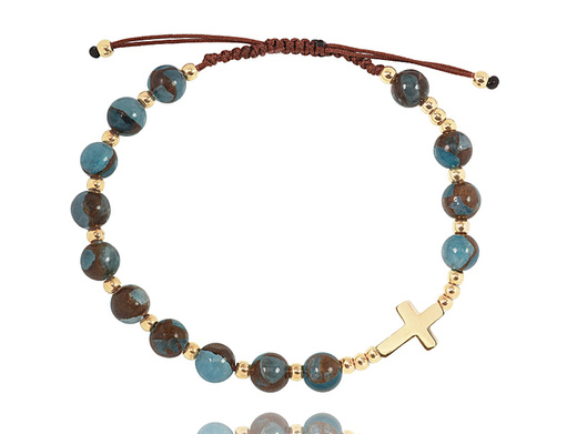 1571/13 bransoletka różaniec złota na sznureczku z porcelanowymi koralikami i krzyżem