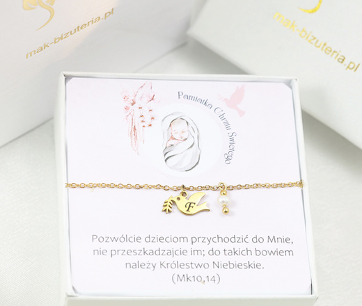 Zestaw prezentowy na Chrzest Św. bransoletka grawerowany z perełkami i gołębiem w pudełku 1798