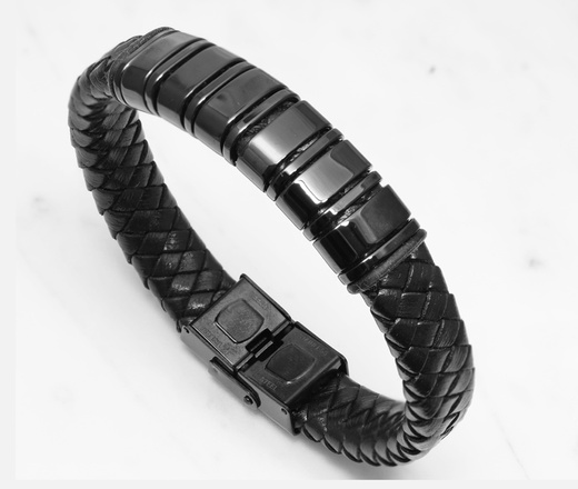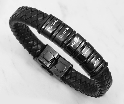 Bransoletka męska z grawerem czarna skóra 1858/2 pięć przekładek