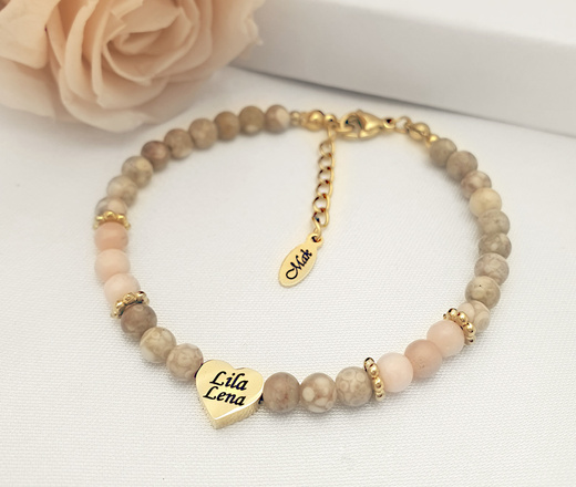 1734/8 różowo-beżowa bransoletka pozłacana z grawerem i kamieniami naturalnymi Premium