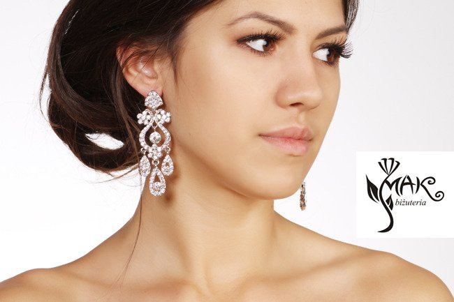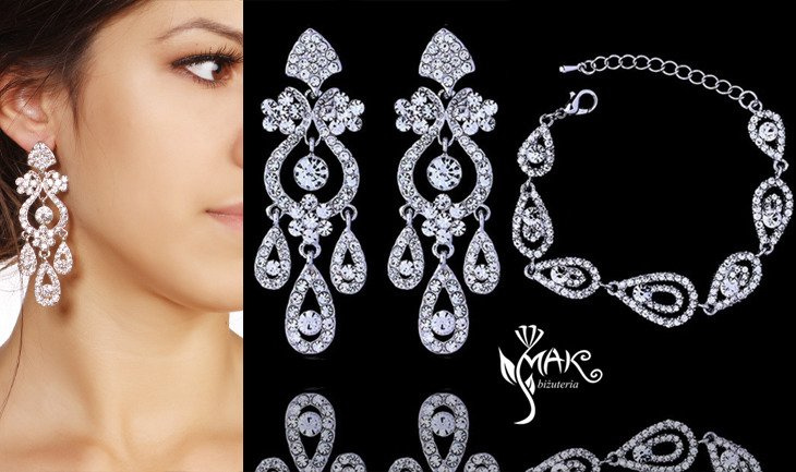 - Przedmiotem oferty jest komplet składający się z kolczyków i bransoletki. Okazałe kolczyki będą świetnym uzupełnieniem zarówno kreacji ślubnej jak i wieczorowej.