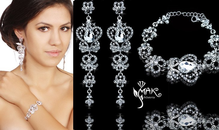 - Przedmiotem oferty jest komplet składający się z kolczyków i bransoletki. Okazałe kolczyki będą świetnym uzupełnieniem zarówno kreacji ślubnej jak i wieczorowej.