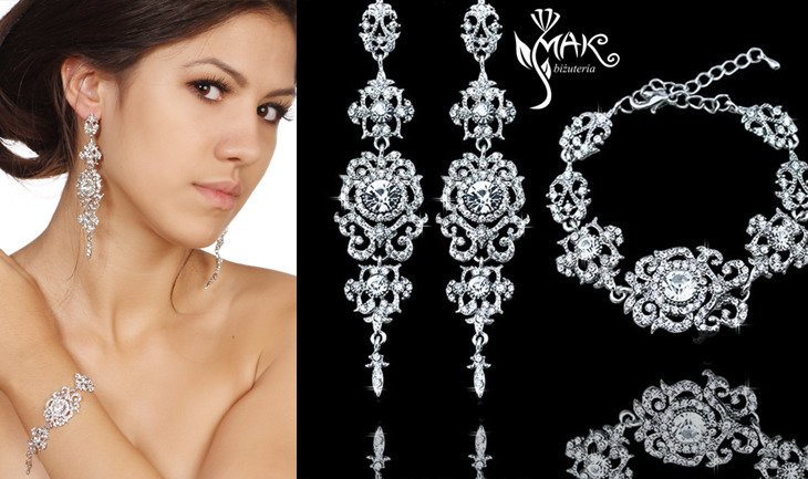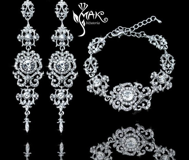 - Przedmiotem oferty jest komplet składający się z kolczyków i bransoletki. Okazałe kolczyki będą świetnym uzupełnieniem zarówno kreacji ślubnej jak i wieczorowej.