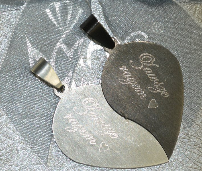 PODWÓJNE BRELOKI DO KLUCZY POŁÓWKI SERCA. WYKONANE Z STALI SZLACHETNEJ, JEDNA CZĘŚĆ SERDUSZKA POKRYTA CZARNĄ EMALIĄ. SZLACHETNA STAL CHIRURGICZNA DOSKONALE SPRAWDZA SIĘ W UŻYTKOWANIU – NIE UCZULA, NIE ZMIENIA KOLORU, HIGIENICZNA. - usługa grawerowania na jednej stronie blaszki w cenie (koszt grawerunku na 2 stronie 9,90 zł/szt); - grawerunek mechaniczny, wykonany frezem diamentowym, kolor grawerunku srebrny; - na jednej połówce zmieścimy ok 20 znaków; WYRAŹ UCZUCIE W NIECODZIENNY SPOSÓB. PODARUJ UKOCHANEJ OSOBIE ORYGINALNY BRELOK. DOSKONAŁY PREZENT DLA PAR, NAJLEPSZYCH PRZYJACIÓŁ. ROZMIAR CAŁEGO SERDUSZKA 3,5 cm x 3,5 cm bez grawerunku. Wizualizacja grawerunku na tym samym serduszku tylko w formie wisiorków. SERDECZNIE ZAPRASZAMY
