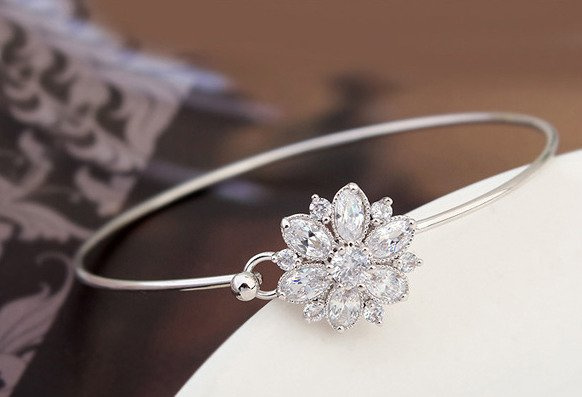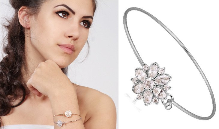 Przedmiotem oferty jest bransoletka wysadzana cyrkoniami. Bransoletka wykonana jest z materiału antyalergicznego pokrytego platyną. Platyna jest metalem o bardzo dobrych właściwościach użytkowych jak i estetycznych. Trwała i bardziej wytrzymała niż złoto. Nie zmienia koloru, nie zachodzi nalotem. Jest antyalergiczna i nie uczula nawet bardzo wrażliwej skóry. Cyrkonie w kolorze krystalicznym. . WYMIARY : Średnica bransoletki 6,3 cm Rozmiar kwiatuszka wysadzanego cyrkoniami 1,5 cm Biżuteria wysokiej jakości, wykonana z dbałością o każdy detal. Charakteryzuje się niepowtarzalnym wzornictwem. Fasetowane cyrkonie pięknie załamują światło i dodają blasku. Precyzyjny szlif sprawia, iż kryształki mają bardzo szeroki współczynnik odbicia światła w każdym kierunku. Podobnie jak w przypadku brylantów występuje zjawisko brylancji w postaci iskrzących się odbić, promienie świetlne padające na taflę kamienia załamują się, co daje efekt wielobarwnych migotliwych refleksów. Trwale pokrycie galwaniczne powoduje, iż biżuteria nie zmienia koloru nawet po długim czasie użytkowania.