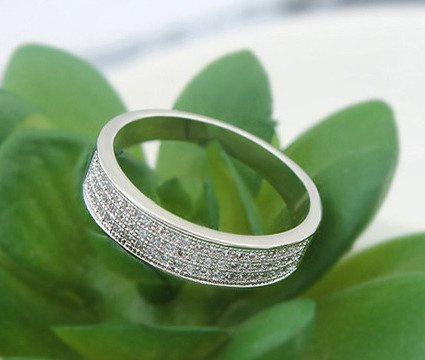 Biżuteria wysokiej jakości, wykonana z dbałością o każdy detal. Charakteryzuje się niepowtarzalnym wzornictwem. Fasetowane cyrkonie pięknie załamują światło i dodają blasku. Precyzyjny szlif sprawia, iż kryształki mają bardzo szeroki współczynnik odbicia światła w każdym kierunku. Podobnie jak w przypadku brylantów występuje zjawisko brylancji w postaci iskrzących się odbić, promienie świetlne padające na taflę kamienia załamują się, co daje efekt wielobarwnych migotliwych refleksów. Trwale pokrycie galwaniczne powoduje, iż biżuteria nie zmienia koloru nawet po długim czasie użytkowania. Pierścionek wykonany z metalu antyalergicznego pokryty platyną. Zdobiony cyrkoniami. Platyna jest metalem o bardzo dobrych właściwościach użytkowych jak i estetycznych. Trwała i bardziej wytrzymała niż złoto. Nie zmienia koloru, nie zachodzi nalotem. Jest antyalergiczna i nie uczula nawet bardzo wrażliwej skóry. Średnica wewnętrzna 18,1 mm, obwód 57 mm Rozmiar pierścionka 17, Szerokość 5 mm