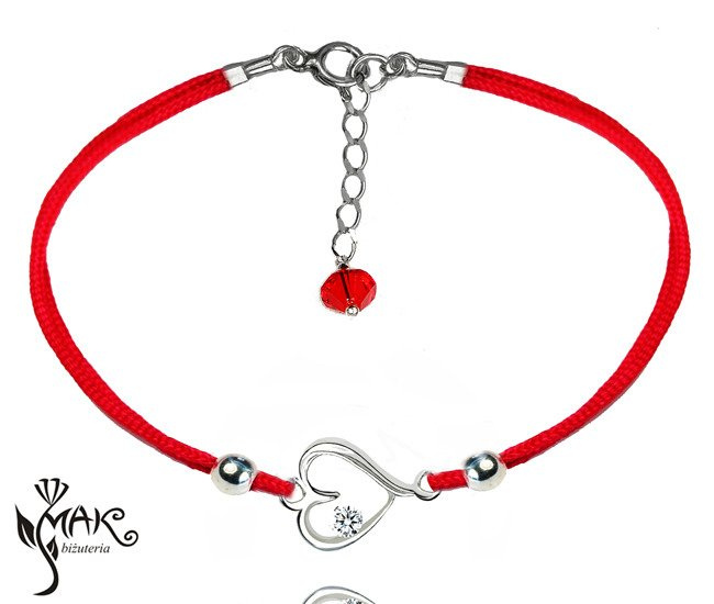 Bransoletka srebrna na sznureczku. Wykonana ze srebra 925 oraz bardzo wytrzymałego sznureczka poliesterowego. Wybrany kolor proszę zamieścić w Uwagach do zamówienia (okienko tekstowe pod danymi teleadresowymi). Wielkość serduszka 1,1 cm *1,1 cm. Łańcuszek regulacyjny zdobiony kryształkiem MADE WITH SWAROVSKI® ELEMENTS, rozmiar 4mm, kolor dobrany do koloru sznureczka. Długość bransoletki 16,5 + 2,5 cm łańcuszek regulacyjny. Bransoletka pakowana w ozdobną sakiewkę z organzy.