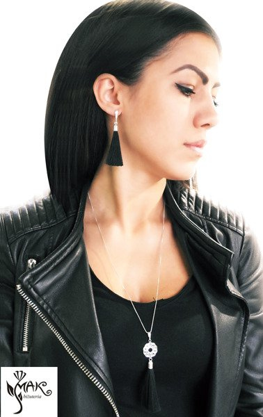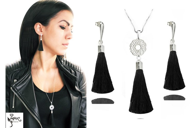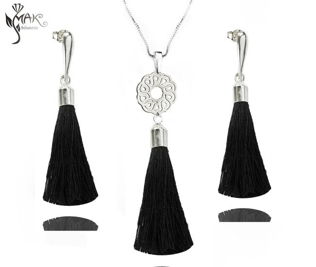 KOL847 komplet chwosty frędzle czarne srebro 925