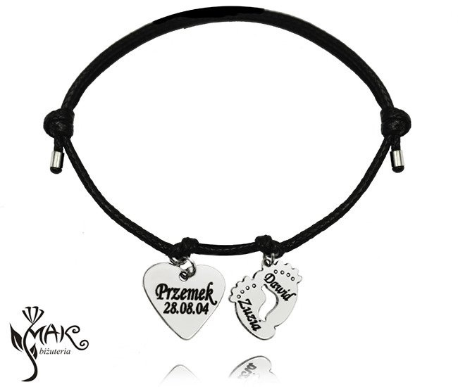 BR826 BRANSOLETKA z grawerem na sznureczku stópki serce