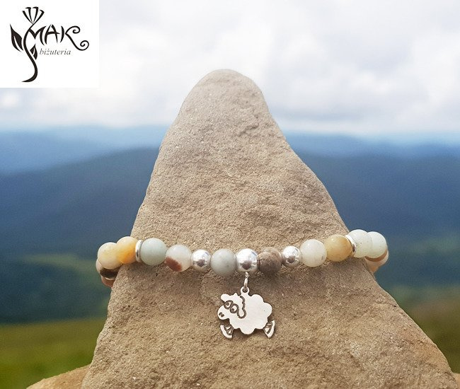 Przedmiotem oferty jest bransoletka z amazonitu z zawieszką w kształcie owieczki. Dobry pomysł na prezent dla małych i dużych miłośniczek gór :-)