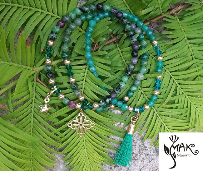 Przedmiotem oferty jest bransoletka wykonana z agatu afrykańskiego w kolorze butelkowej zieleni. Bransoletka jest elastyczna i dopasowuje się do obwodu nadgarstka.