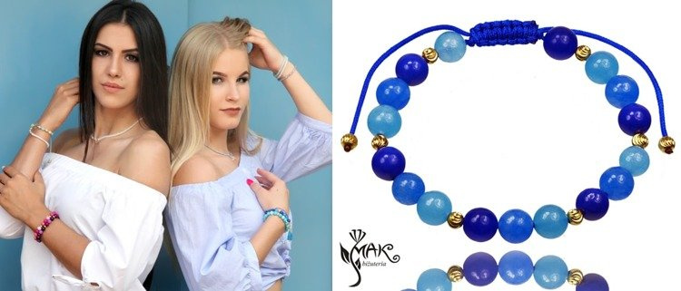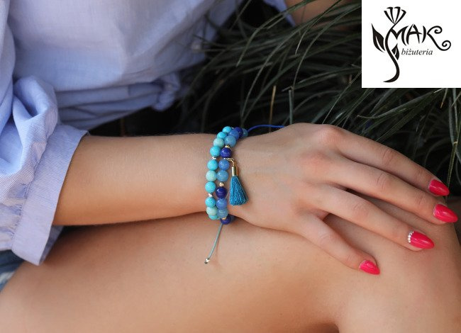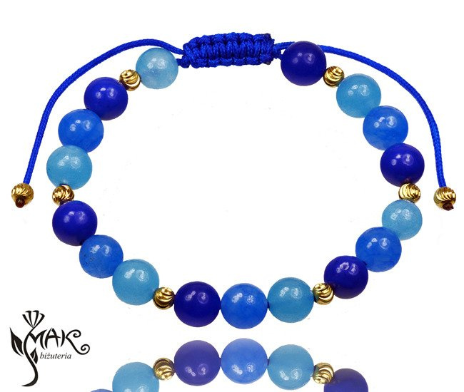 Oferujemy ciekawą bransoletkę z jadeitów w różnych odcieniach niebieskiego. Kuleczki jadeitów nałożone na wytrzymały sznureczek poliestrowy. Bransoletka wygodna zarówno w zakładaniu jak i noszeniu.