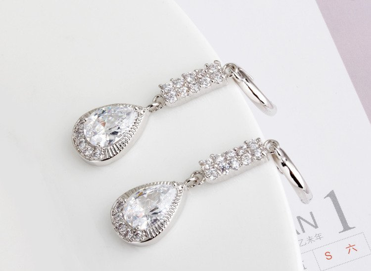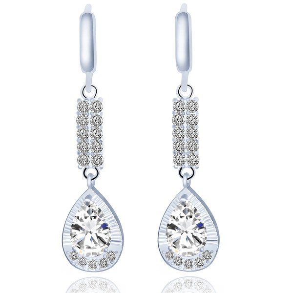 Kolczyki z przedłużką oraz cyrkoniami w kształcie łezek na sztyft. Długie kolczyki z ciekawymi wykończeniami sprawdzą się doskonale w roli biżuterii ślubnej. Wykonane z materiałów wysokiej jakości będą nadawać stylizacji szyku i elegancji.