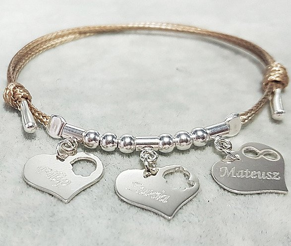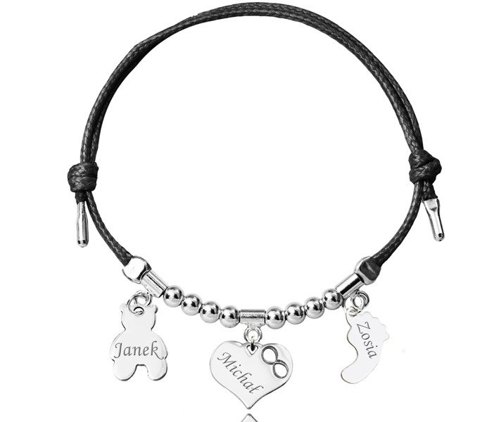 BR962 BRANSOLETKA Z GRAWEREM srebrna na sznurku serce, miś, stópka