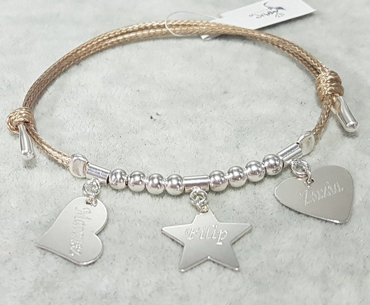 Proponujemy srebrną bransoletkę z grawerem. Bransoletka wykonana ze srebra 925 oraz sznurka dostępnego w różnych kolorach. Dużym atutem jest możliwość wyboru jednej z wielu zawieszek srebrnych oraz koloru sznurka.