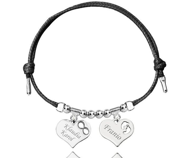 BRANSOLETKA Z GRAWEREM, BRANSOLETKA GRAWEROWANA. Śliczna bransoletka z serduszkami posiadającymi ażurowe wzory, w kształcie znaku nieskończoności oraz stópek. Na drugiej części serduszek wykonamy grawerunek. Srebrne elementy podwieszone na sznureczku tworzą ciekawą i wyjątkową biżuterię.