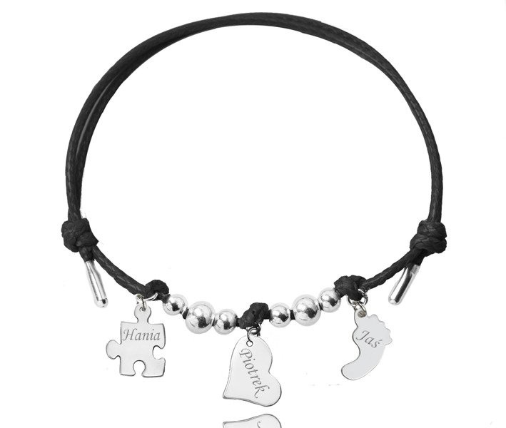 Proponujemy srebrną bransoletkę z grawerem. Bransoletka wykonana ze srebra 925 oraz sznurka dostępnego w różnych kolorach. Dużym atutem jest możliwość wyboru jednej z wielu zawieszek srebrnych . Barwne sznureczki, ciekawe wzory zawieszek z indywidualnym grawerunkiem sprawią, że Twoja bransoletka będzie jedyna w swoim rodzaju.