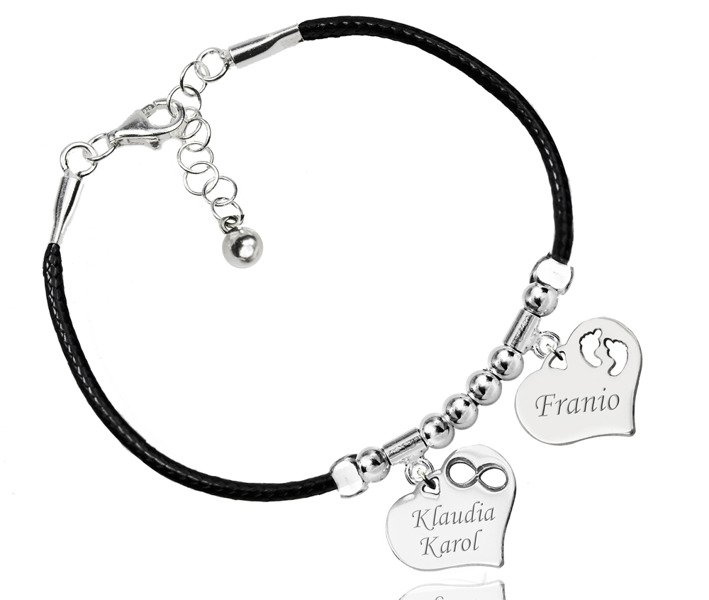 BRANSOLETKA Z GRAWEREM, BRANSOLETKA GRAWEROWANA. Śliczna bransoletka z serduszkami posiadającymi ażurowe wzory, w kształcie znaku nieskończoności oraz stópek. Na drugiej części serduszek wykonamy grawerunek. Srebrne elementy podwieszone na sznureczku tworzą ciekawą i wyjątkową biżuterię.