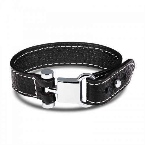Rzemyk ze skóry w kolorze czarnym z białymi przeszyciami. Długość bransoletki: 17 cm. Szerokość paseczka 14 mm. Bransoletka pakowana w pudełeczko .
