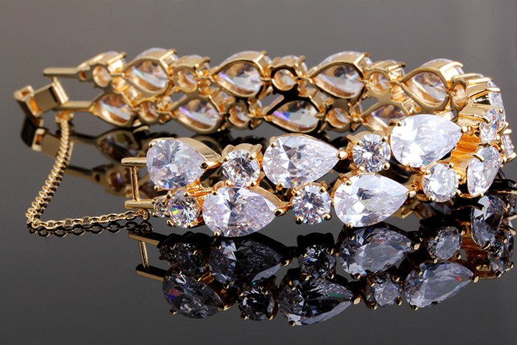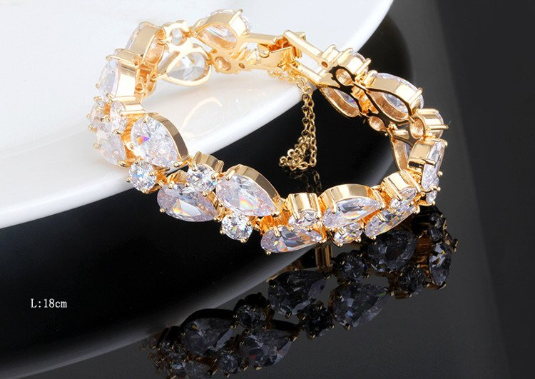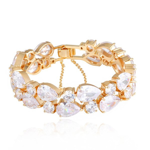 Pozłacana bransoletka z dużymi cyrkoniami w kształcie łezki i kółka. Bransoletka wysokiej jakości z pewnością zaspokoi potrzeby najbardziej wymagającej klientki. Doskonały dodatek na każdą ważną okazję, będzie świetnym uzupełnieniem wyjściowego ubioru.