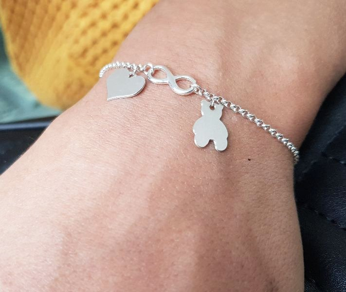 Przedmiotem oferty jest bransoletka srebrna ze znakiem nieskończoności oraz dwiema zawieszkami pod grawerunek.