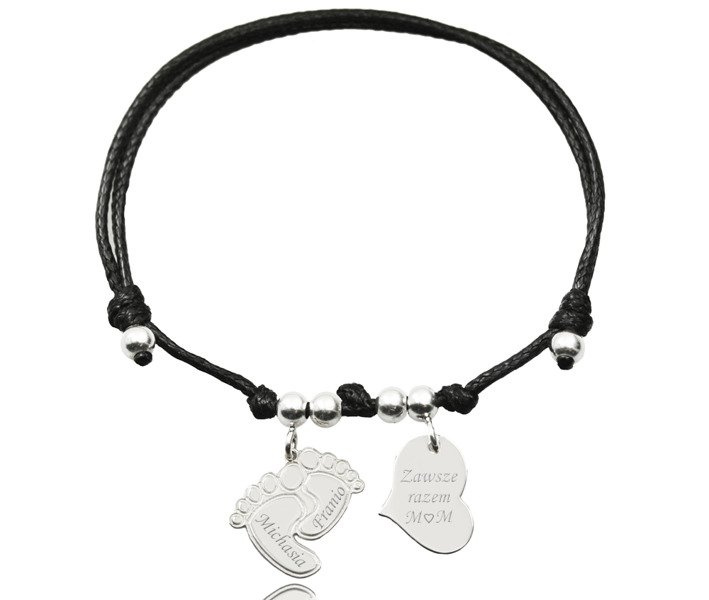 Proponujemy bransoletkę z dwiema zawieszkami. Serduszko na którym wygrawerujemy imię męża oraz stópki z imionami dzieci. Zawieszki są podwieszone są na sznureczku. Dodatkową ozdobą bransoletki są błyszczące kuleczki.