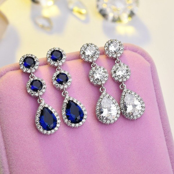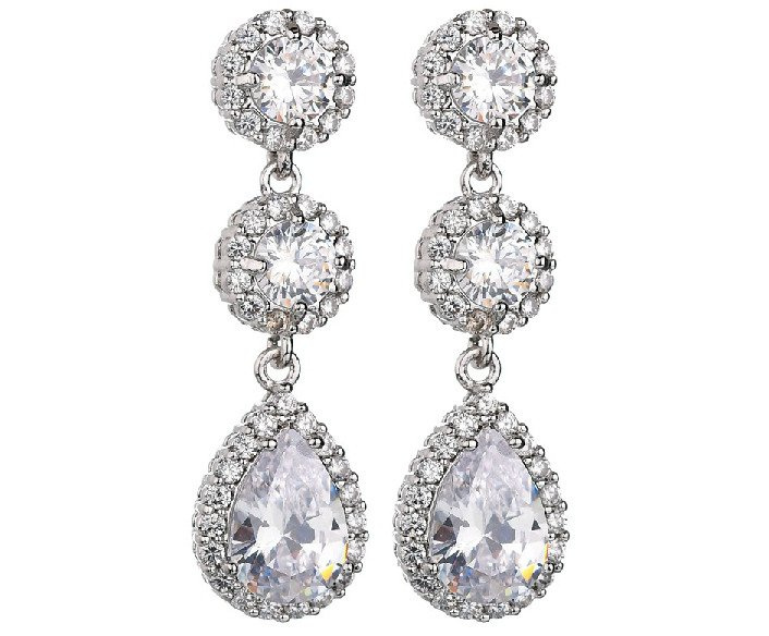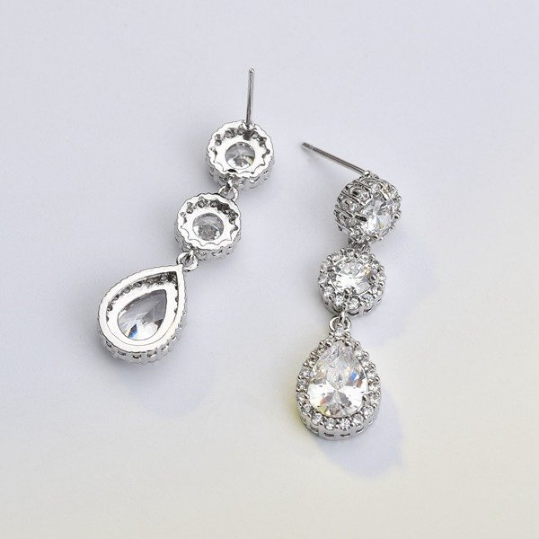 Długie, eleganckie kolczyki składające się z łączników w kształcie okrągłych cyrkonii, uwieńczeniem kolczyka jest łezka otoczona drobnymi połyskującymi cyrkoniami.  Kolczyki będą wspaniałym dodatkiem do sukni ślubnej.