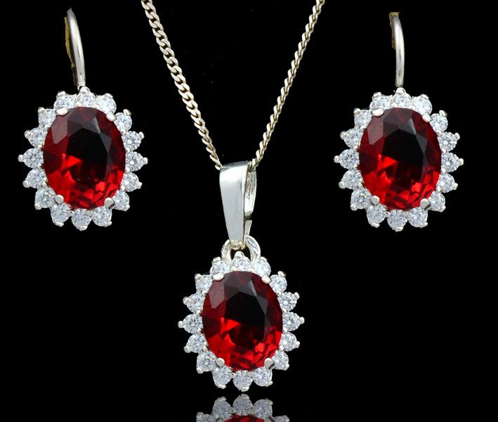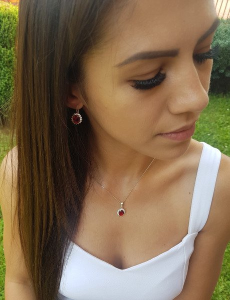 Komplet srebrny w kształcie ażurowych owali. Komplet składa się z kolczyków, wisiorka. W środku owali zatopione są ciemnoczerwone cyrkonie.