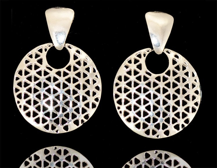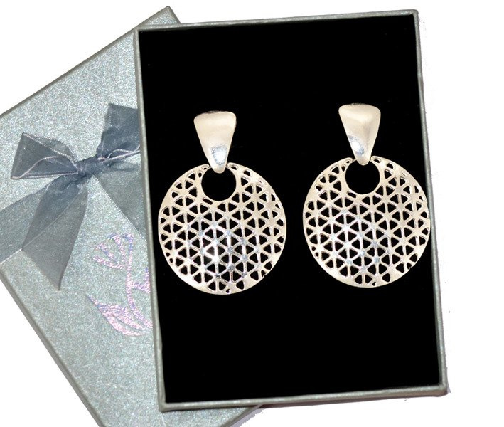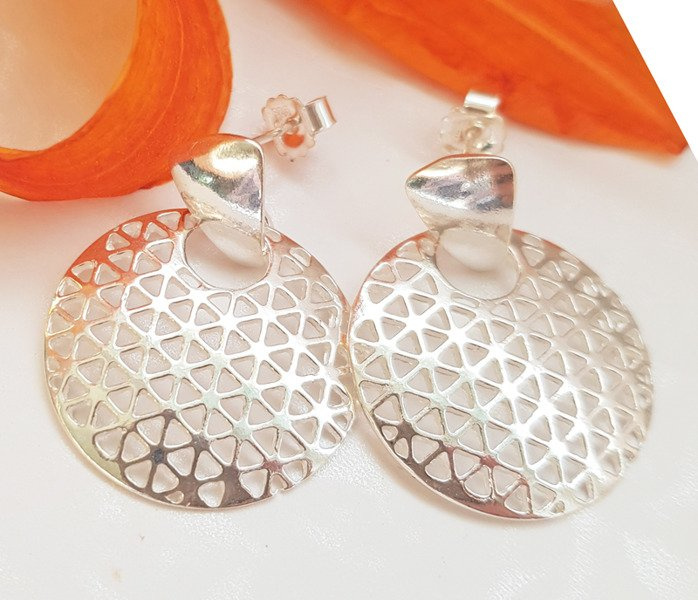 Kolczyki srebrne w kształcie ażurowych łezek. W środku kolczyków znajduje się otwór w kształcie łzy.