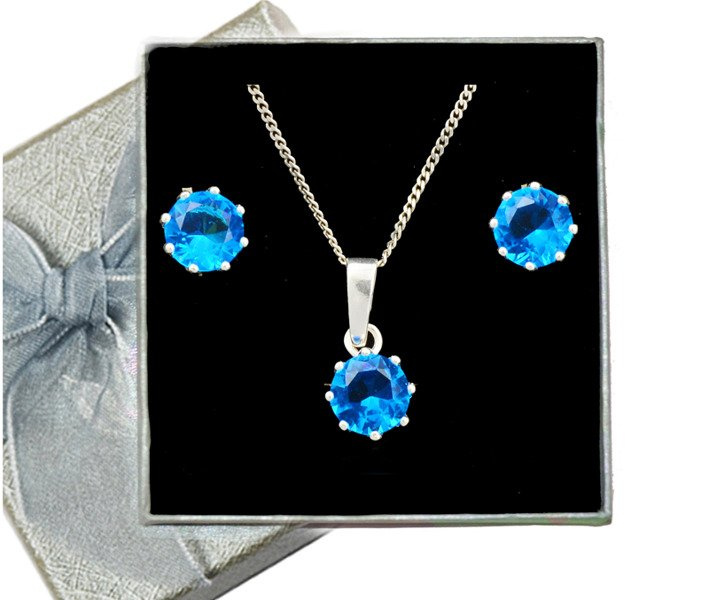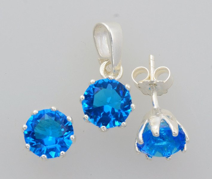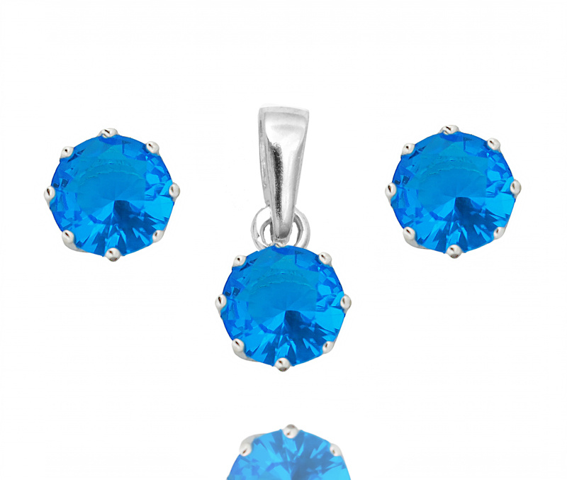 Komplet srebrny w kształcie kół. Komplet składa się z kolczyków, wisiorka. W środku koła zatopiona jest jasnoniebieska cyrkonia.