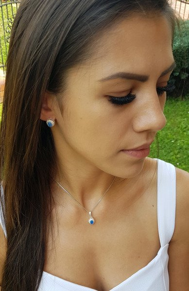 Komplet srebrny z cyrkoniami. Komplet składa się z kolczyków, wisiorka. W środku koła zatopiona jest jasnoniebieska cyrkonia.