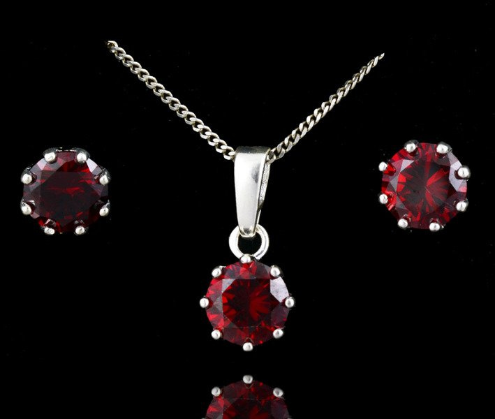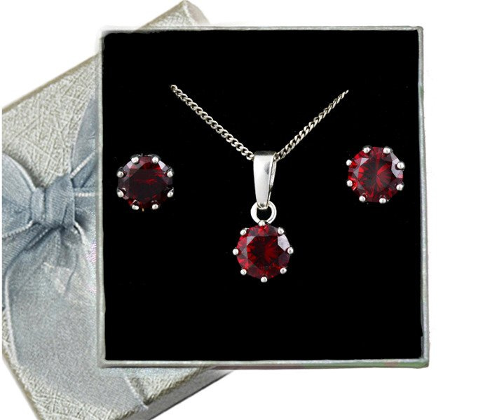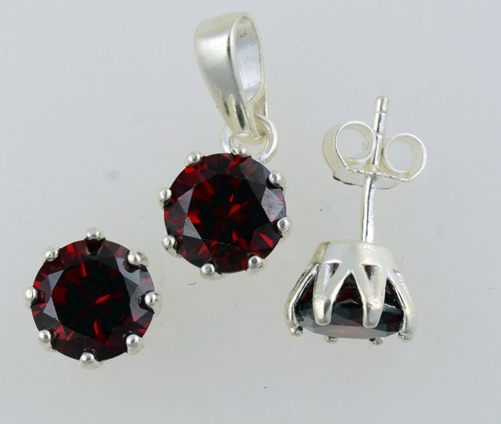 Komplet srebrny z pokaźnymi cyrkoniami. Komplet składa się z kolczyków, wisiorka. W środku kolczyka zatopiona jest bordową cyrkonia.