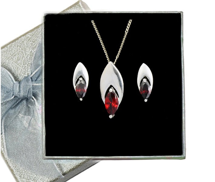 Komplet srebrny w kształcie łezek. Komplet składa się z kolczyków, wisiorka. W środku łezki zatopiona jest rubinowa cyrkonia.
