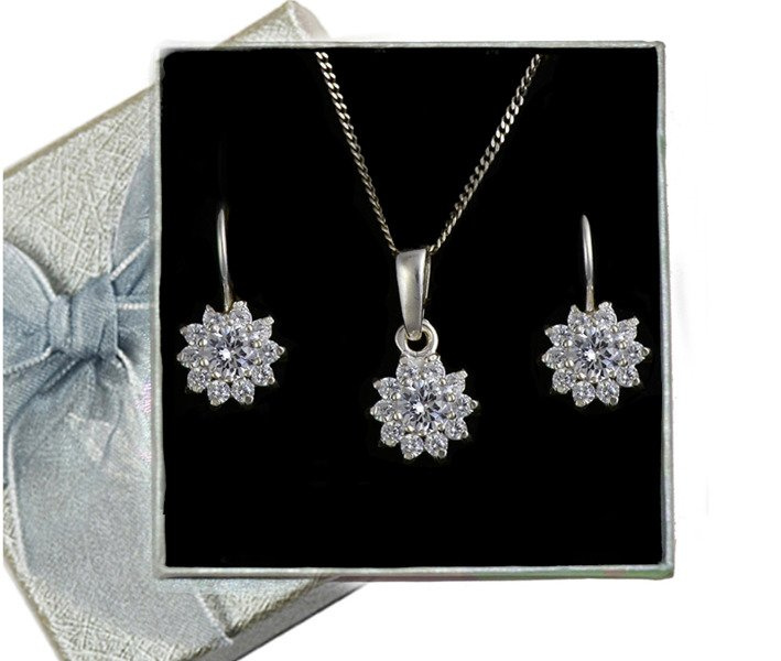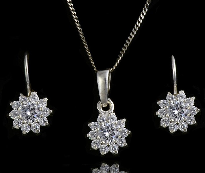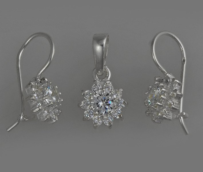 Komplet srebrny w kształcie kwiatuszków. Komplet składa się z kolczyków, wisiorka. W środku znajduje się duża cyrkonia otoczona drobnymi błyszczącymi cyrkoniami.