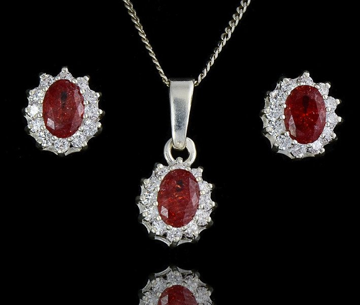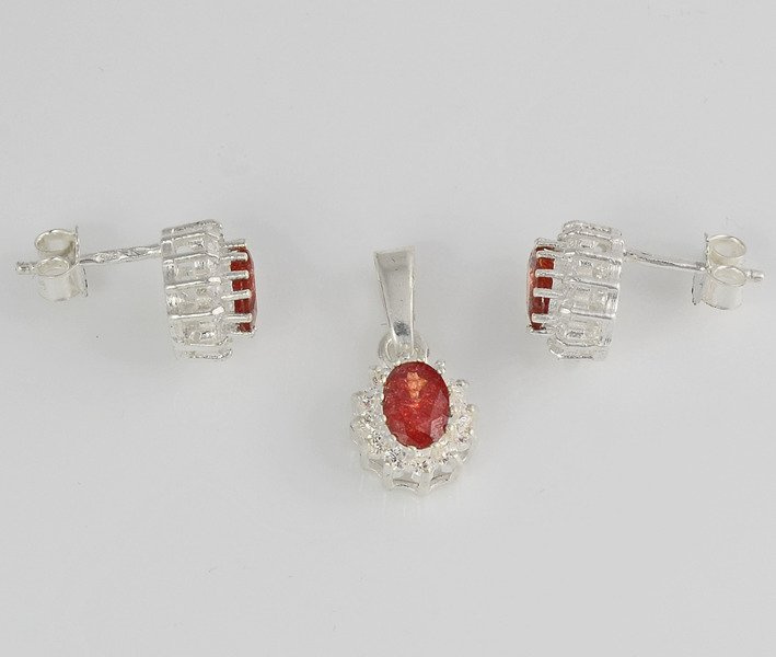 Komplet srebrny w kształcie owalu. Komplet składa się z kolczyków, wisiorka. W środku znajduje się duża cyrkonia w odcieniu bladego brązu otoczona drobnymi błyszczącymi cyrkoniami.