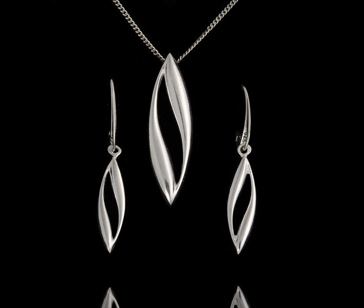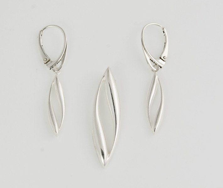 Komplet srebrny w kształcie łez. Komplet składa się z kolczyków, wisiorka.